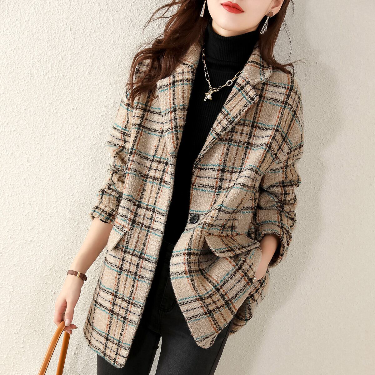 通勤/OL ラシャ チェック柄 折襟 ボタン コート